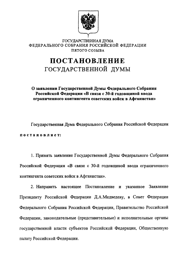 "О ЗАЯВЛЕНИИ ГОСУДАРСТВЕННОЙ ДУМЫ ФЕДЕРАЛЬНОГО СОБРАНИЯ РОССИЙСКОЙ ФЕДЕРАЦИИ "В СВЯЗИ С 30-Й ГОДОВЩИНОЙ ВВОДА ОГРАНИЧЕННОГО КОНТИНГЕНТА СОВЕТСКИХ ВОЙСК В АФГАНИСТАН"