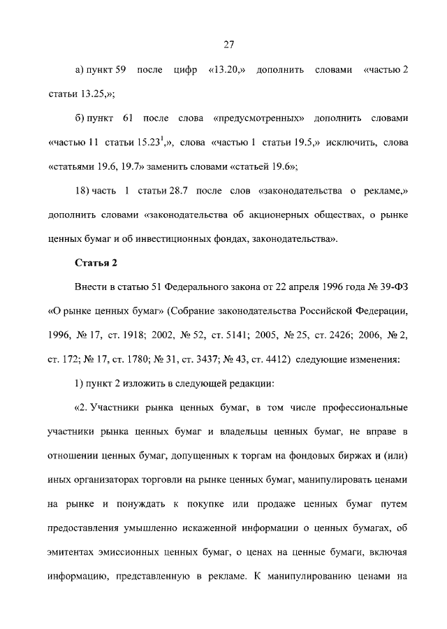 "О ВНЕСЕНИИ ИЗМЕНЕНИЙ В КОДЕКС РОССИЙСКОЙ ФЕДЕРАЦИИ ОБ АДМИНИСТРАТИВНЫХ ПРАВОНАРУШЕНИЯХ В ЧАСТИ УСИЛЕНИЯ АДМИНИСТРАТИВНОЙ ОТВЕТСТВЕННОСТИ ЗА НАРУШЕНИЕ ЗАКОНОДАТЕЛЬСТВА РОССИЙСКОЙ ФЕДЕРАЦИИ ОБ АКЦИОНЕРНЫХ ОБЩЕСТВАХ, ОБ ОБЩЕСТВАХ С ОГРАНИЧЕННОЙ ОТВЕТСТВЕННОСТЬЮ, О РЫНКЕ ЦЕННЫХ БУМАГ И ОБ ИНВЕСТИЦИОННЫХ ФОНДАХ И ФЕДЕРАЛЬНЫЙ ЗАКОН "О РЫНКЕ ЦЕННЫХ БУМАГ" В ЧАСТИ УТОЧНЕНИЯ ОПРЕДЕЛЕНИЯ И КОНКРЕТИЗАЦИИ ПРИЗНАКОВ МАНИПУЛИРОВАНИЯ ЦЕНАМИ НА РЫНКЕ ЦЕННЫХ БУМАГ"
