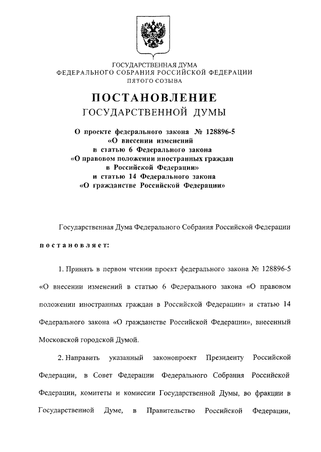 "О ПРОЕКТЕ ФЕДЕРАЛЬНОГО ЗАКОНА N 128896-5 "О ВНЕСЕНИИ ИЗМЕНЕНИЙ В