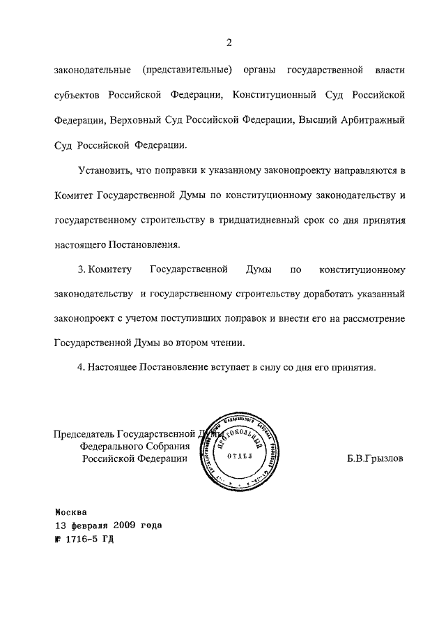 ПОСТАНОВЛЕНИЕ ГД ФС РФ от 13.02.2009 N 1716-5 ГД