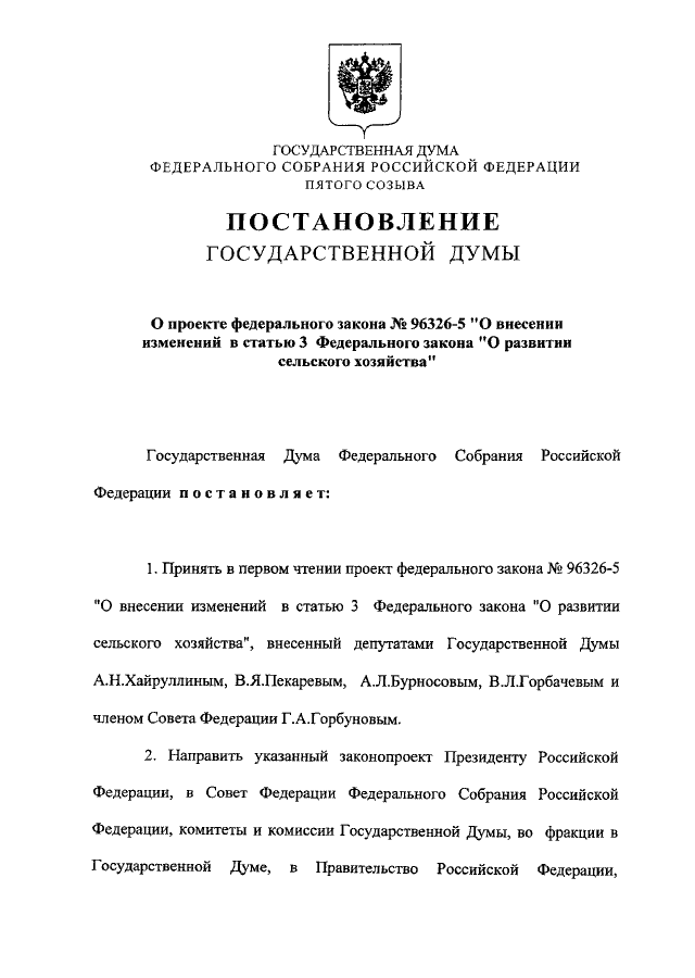 "О ПРОЕКТЕ ФЕДЕРАЛЬНОГО ЗАКОНА N 96326-5 "О ВНЕСЕНИИ ИЗМЕНЕНИЙ В СТАТЬЮ 3 ФЕДЕРАЛЬНОГО ЗАКОНА "О РАЗВИТИИ СЕЛЬСКОГО ХОЗЯЙСТВА"