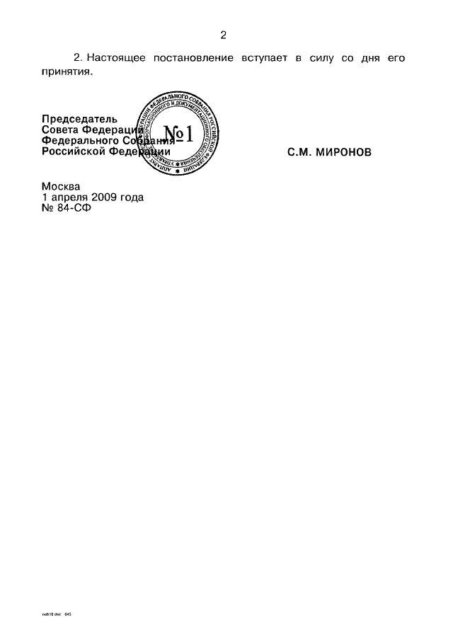 ПОСТАНОВЛЕНИЕ СФ ФС РФ от 01.04.2009 N 84-СФ