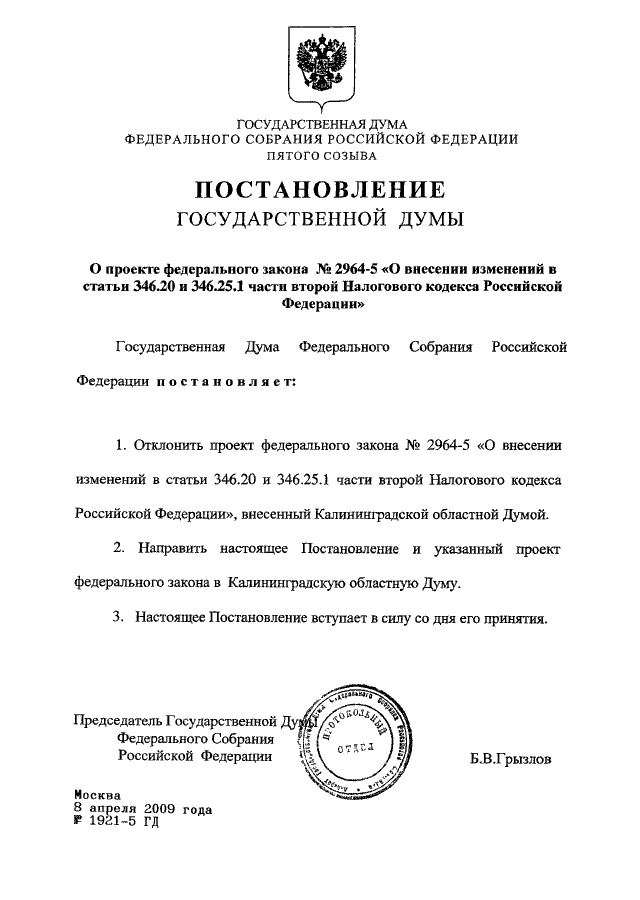 ПОСТАНОВЛЕНИЕ ГД ФС РФ от 08.04.2009 N 1921-5 ГД