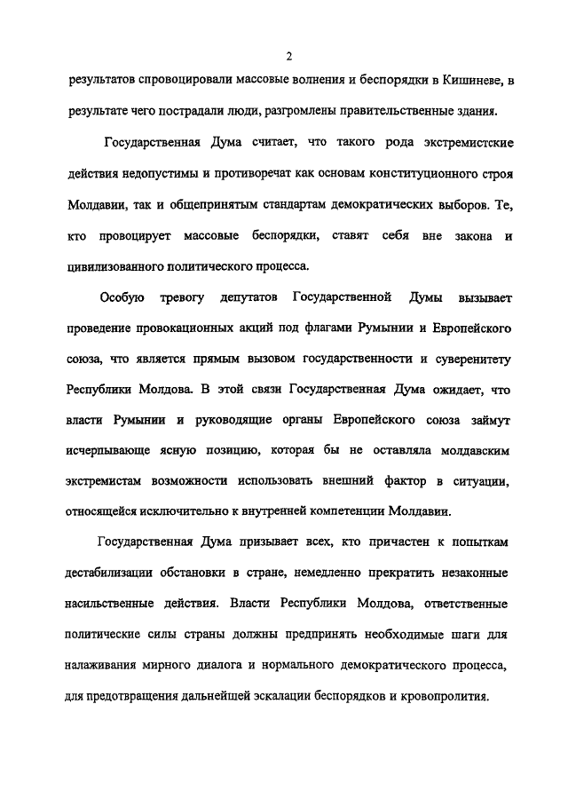 "О ЗАЯВЛЕНИИ ГОСУДАРСТВЕННОЙ ДУМЫ ФЕДЕРАЛЬНОГО СОБРАНИЯ РОССИЙСКОЙ ФЕДЕРАЦИИ "О СОБЫТИЯХ В РЕСПУБЛИКЕ МОЛДОВА"
