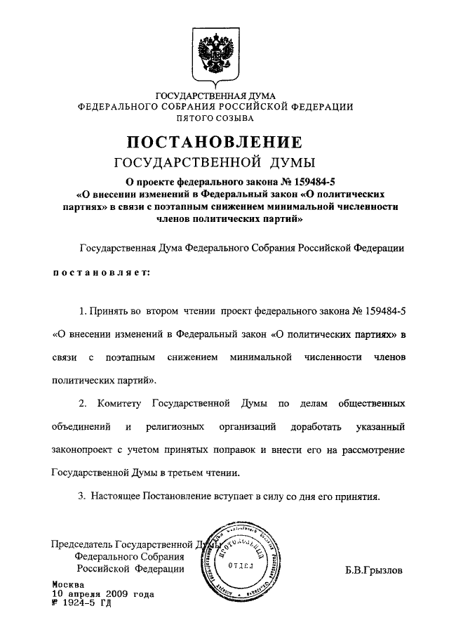 ПОСТАНОВЛЕНИЕ ГД ФС РФ от 10.04.2009 N 1924-5 ГД