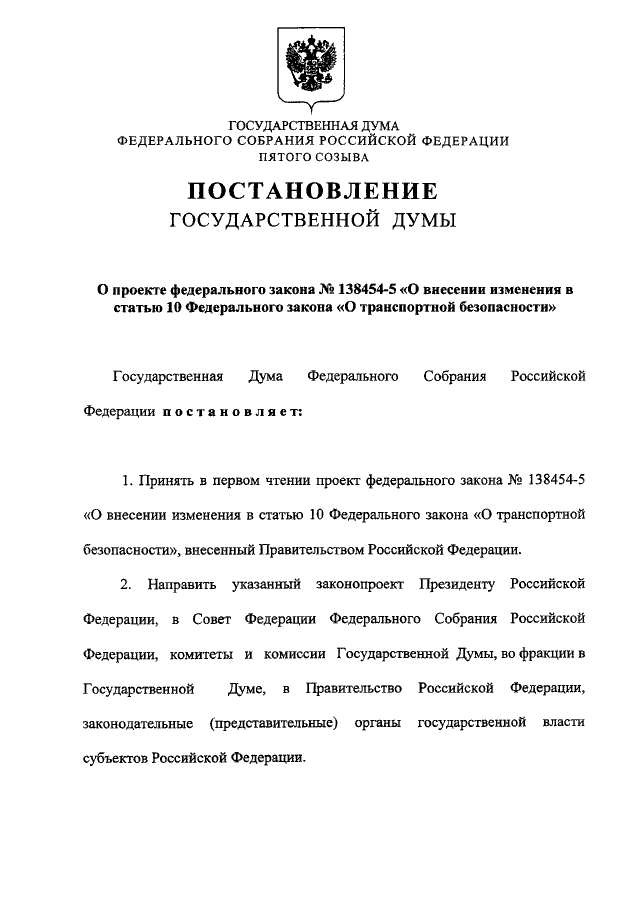 "О ПРОЕКТЕ ФЕДЕРАЛЬНОГО ЗАКОНА N 138454-5 "О ВНЕСЕНИИ ИЗМЕНЕНИЯ В СТАТЬЮ 10 ФЕДЕРАЛЬНОГО ЗАКОНА "О ТРАНСПОРТНОЙ БЕЗОПАСНОСТИ"