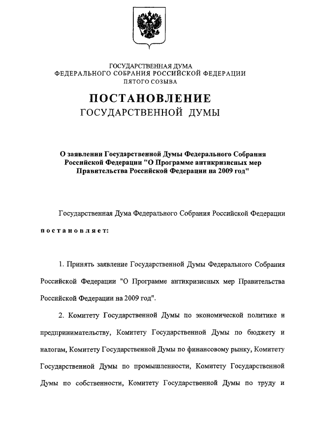 "О ЗАЯВЛЕНИИ ГОСУДАРСТВЕННОЙ ДУМЫ ФЕДЕРАЛЬНОГО СОБРАНИЯ РОССИЙСКОЙ ФЕДЕРАЦИИ "О ПРОГРАММЕ АНТИКРИЗИСНЫХ МЕР ПРАВИТЕЛЬСТВА РОССИЙСКОЙ ФЕДЕРАЦИИ НА 2009 ГОД"