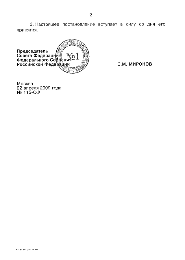ПОСТАНОВЛЕНИЕ СФ ФС РФ от 22.04.2009 N 115-СФ