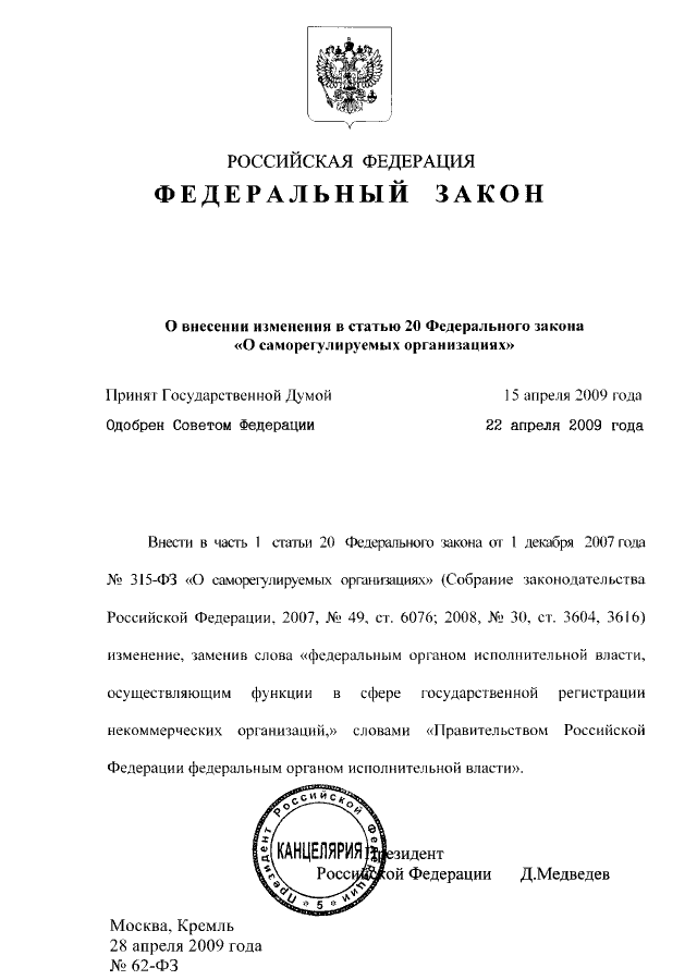 ФЕДЕРАЛЬНЫЙ ЗАКОН от 28.04.2009 N 62-ФЗ