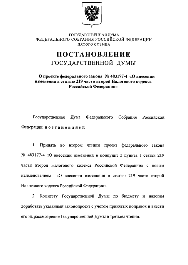"О ПРОЕКТЕ ФЕДЕРАЛЬНОГО ЗАКОНА N 483177-4 "О ВНЕСЕНИИ ИЗМЕНЕНИЯ В СТАТЬЮ 219 ЧАСТИ ВТОРОЙ НАЛОГОВОГО КОДЕКСА РОССИЙСКОЙ ФЕДЕРАЦИИ"