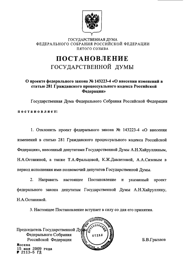 ПОСТАНОВЛЕНИЕ ГД ФС РФ от 15.05.2009 N 2113-5 ГД
