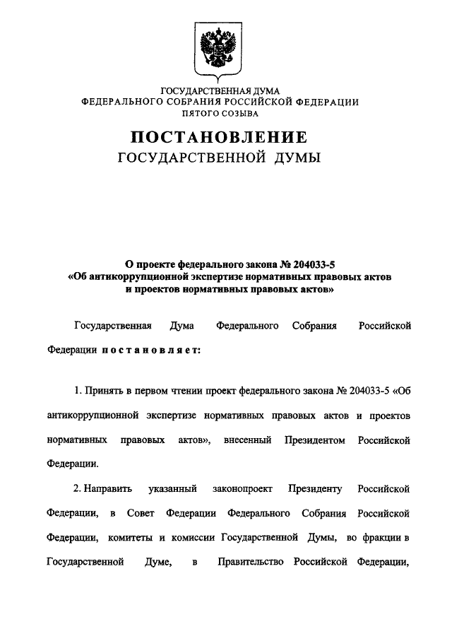 "О ПРОЕКТЕ ФЕДЕРАЛЬНОГО ЗАКОНА N 204033-5 "ОБ АНТИКОРРУПЦИОННОЙ ЭКСПЕРТИЗЕ НОРМАТИВНЫХ ПРАВОВЫХ АКТОВ И ПРОЕКТОВ НОРМАТИВНЫХ ПРАВОВЫХ АКТОВ"