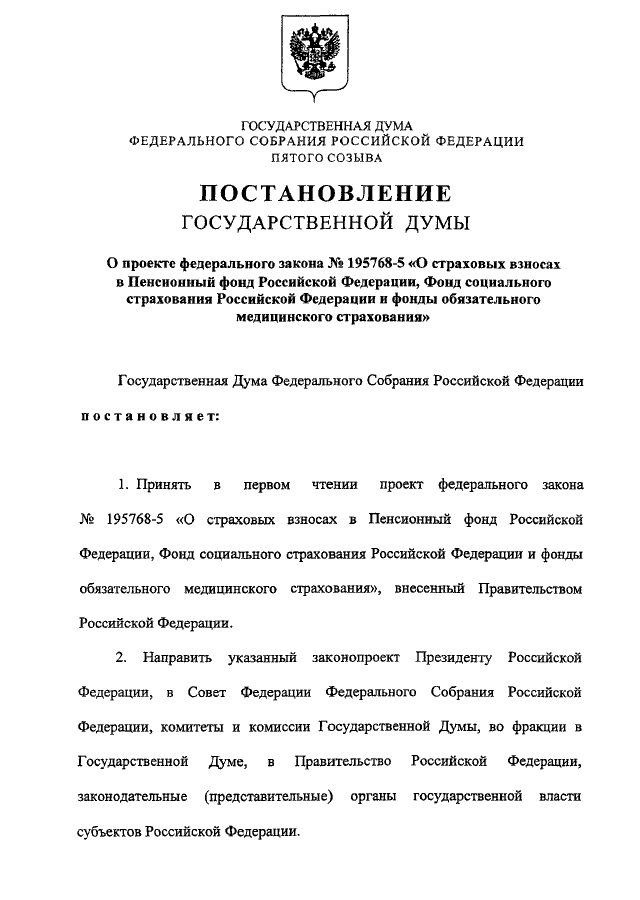 "О ПРОЕКТЕ ФЕДЕРАЛЬНОГО ЗАКОНА N 195768-5 "О СТРАХОВЫХ ВЗНОСАХ В ПЕНСИОННЫЙ ФОНД РОССИЙСКОЙ ФЕДЕРАЦИИ, ФОНД СОЦИАЛЬНОГО СТРАХОВАНИЯ РОССИЙСКОЙ ФЕДЕРАЦИИ И ФОНДЫ ОБЯЗАТЕЛЬНОГО МЕДИЦИНСКОГО СТРАХОВАНИЯ"