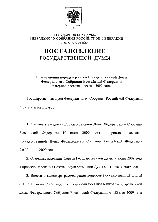 "ОБ ИЗМЕНЕНИИ ПОРЯДКА РАБОТЫ ГОСУДАРСТВЕННОЙ ДУМЫ ФЕДЕРАЛЬНОГО СОБРАНИЯ РОССИЙСКОЙ ФЕДЕРАЦИИ В ПЕРИОД ВЕСЕННЕЙ СЕССИИ 2009 ГОДА"