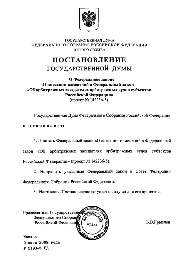 ПОСТАНОВЛЕНИЕ ГД ФС РФ от 05.06.2009 N 2193-5 ГД