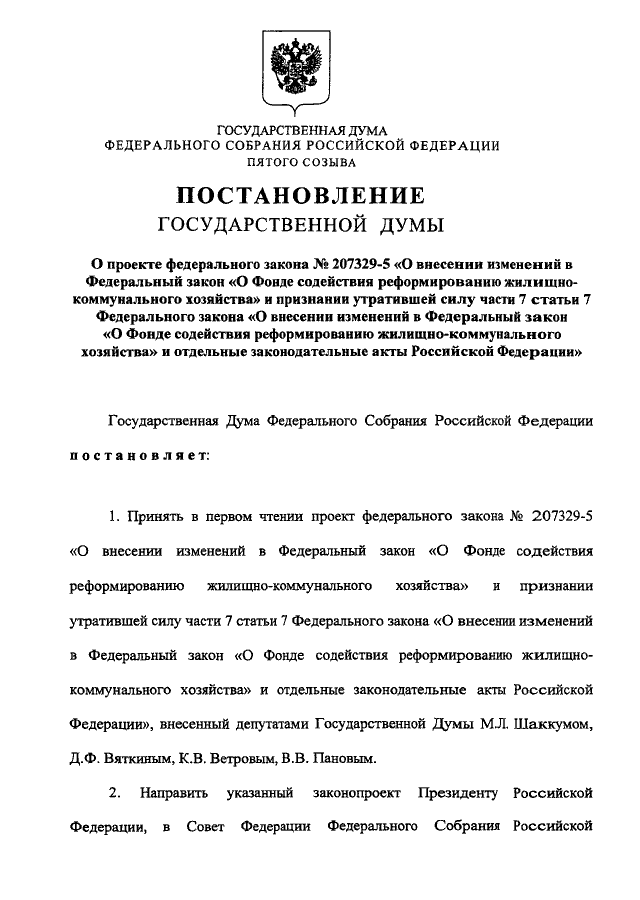 "О ПРОЕКТЕ ФЕДЕРАЛЬНОГО ЗАКОНА N 207329-5 "О ВНЕСЕНИИ ИЗМЕНЕНИЙ В ФЕДЕРАЛЬНЫЙ ЗАКОН "О ФОНДЕ СОДЕЙСТВИЯ РЕФОРМИРОВАНИЮ ЖИЛИЩНО - КОММУНАЛЬНОГО ХОЗЯЙСТВА" И ПРИЗНАНИИ УТРАТИВШЕЙ СИЛУ ЧАСТИ 7 СТАТЬИ 7 ФЕДЕРАЛЬНОГО ЗАКОНА "О ВНЕСЕНИИ ИЗМЕНЕНИЙ В ФЕДЕРАЛЬНЫЙ ЗАКОН "О ФОНДЕ СОДЕЙСТВИЯ РЕФОРМИРОВАНИЮ ЖИЛИЩНО - КОММУНАЛЬНОГО ХОЗЯЙСТВА" И ОТДЕЛЬНЫЕ ЗАКОНОДАТЕЛЬНЫЕ АКТЫ РОССИЙСКОЙ ФЕДЕРАЦИИ"