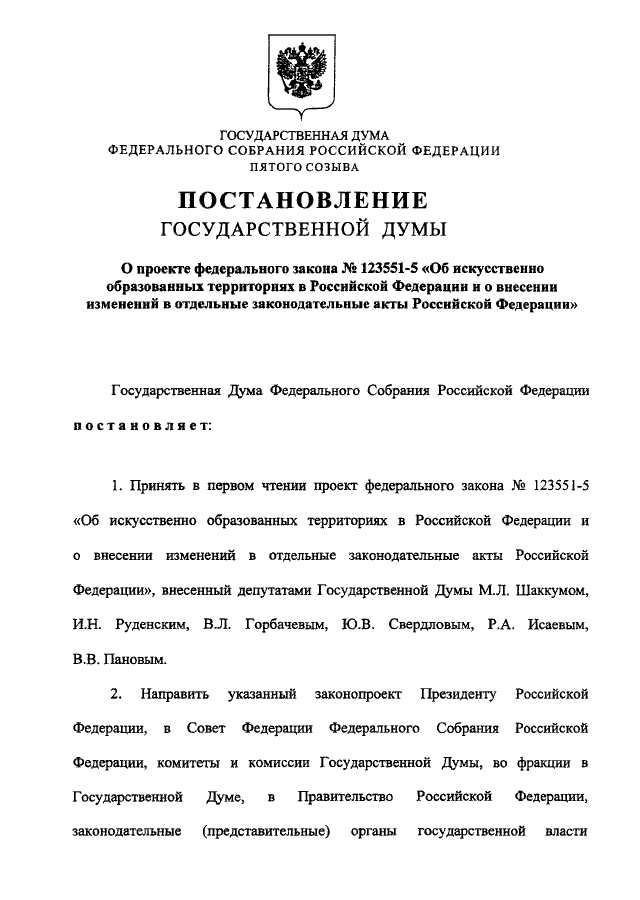 "О ПРОЕКТЕ ФЕДЕРАЛЬНОГО ЗАКОНА N 123551-5 "ОБ ИСКУССТВЕННО ОБРАЗОВАННЫХ ТЕРРИТОРИЯХ В РОССИЙСКОЙ ФЕДЕРАЦИИ И О ВНЕСЕНИИ ИЗМЕНЕНИЙ В ОТДЕЛЬНЫЕ ЗАКОНОДАТЕЛЬНЫЕ АКТЫ РОССИЙСКОЙ ФЕДЕРАЦИИ"