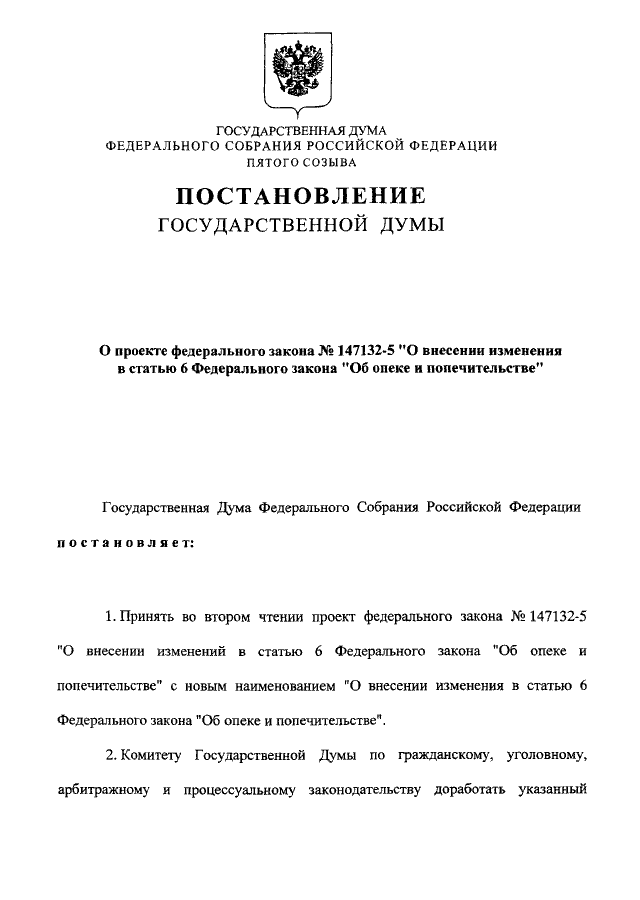 "О ПРОЕКТЕ ФЕДЕРАЛЬНОГО ЗАКОНА N 147132-5 "О ВНЕСЕНИИ ИЗМЕНЕНИЯ В СТАТЬЮ 6 ФЕДЕРАЛЬНОГО ЗАКОНА "ОБ ОПЕКЕ И ПОПЕЧИТЕЛЬСТВЕ"