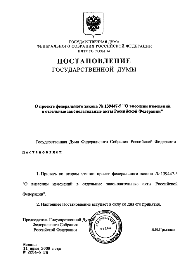 ПОСТАНОВЛЕНИЕ ГД ФС РФ от 11.06.2009 N 2254-5 ГД