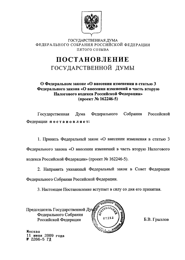 ПОСТАНОВЛЕНИЕ ГД ФС РФ от 11.06.2009 N 2266-5 ГД