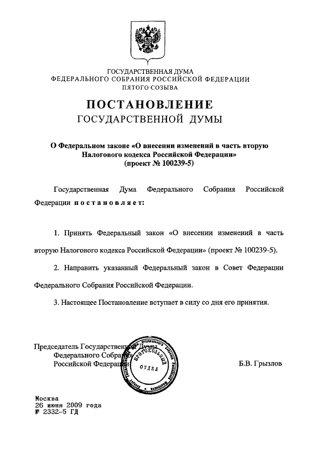 ПОСТАНОВЛЕНИЕ ГД ФС РФ от 26.06.2009 N 2332-5 ГД