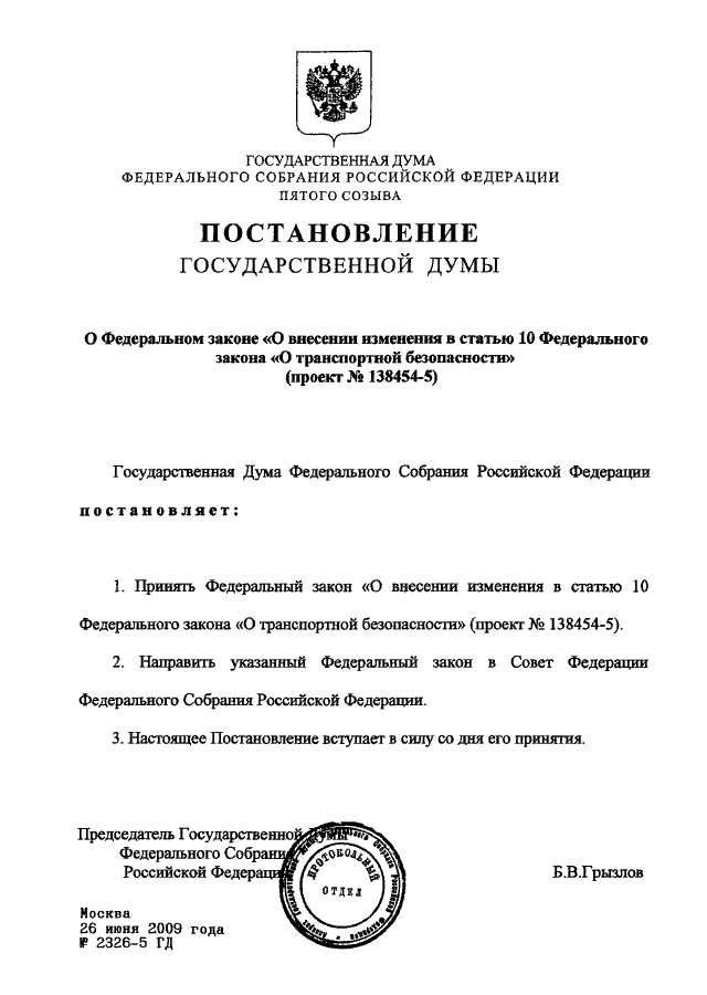 ПОСТАНОВЛЕНИЕ ГД ФС РФ от 26.06.2009 N 2326-5 ГД