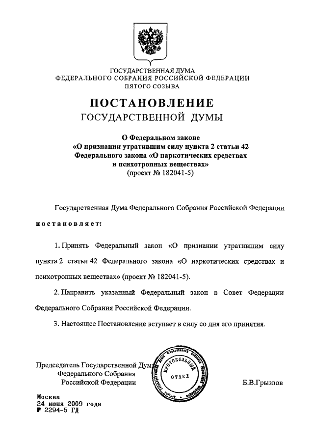 "О ФЕДЕРАЛЬНОМ ЗАКОНЕ "О ПРИЗНАНИИ УТРАТИВШИМ СИЛУ ПУНКТА 2 СТАТЬИ 42 ФЕДЕРАЛЬНОГО ЗАКОНА "О НАРКОТИЧЕСКИХ СРЕДСТВАХ И ПСИХОТРОПНЫХ ВЕЩЕСТВАХ" (ПРОЕКТ N 182041-5)"