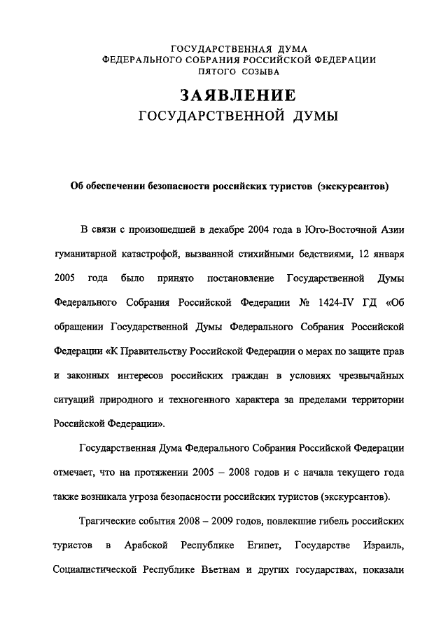 "О ЗАЯВЛЕНИИ ГОСУДАРСТВЕННОЙ ДУМЫ ФЕДЕРАЛЬНОГО СОБРАНИЯ РОССИЙСКОЙ ФЕДЕРАЦИИ "ОБ ОБЕСПЕЧЕНИИ БЕЗОПАСНОСТИ РОССИЙСКИХ ТУРИСТОВ (ЭКСКУРСАНТОВ)"
