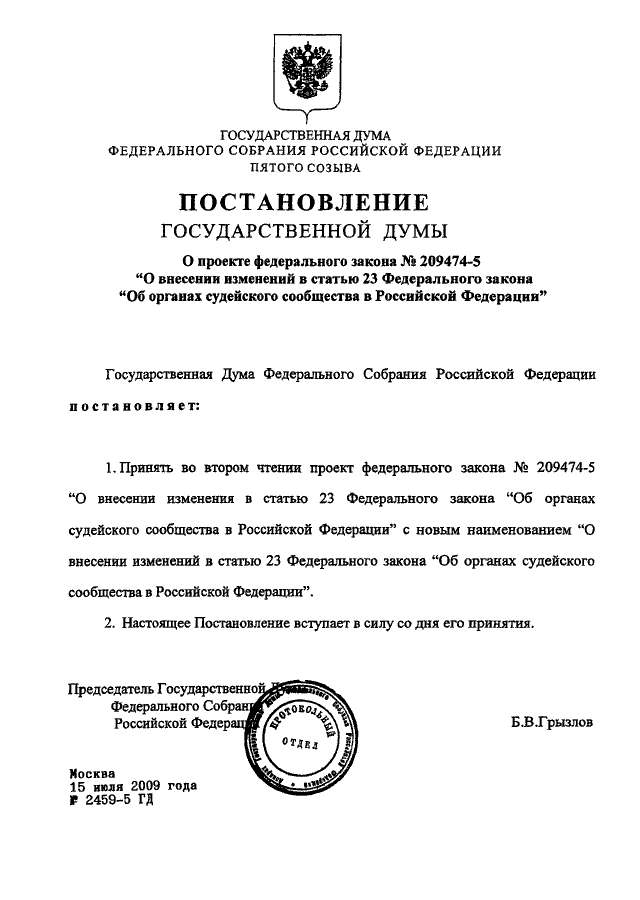 ПОСТАНОВЛЕНИЕ ГД ФС РФ от 15.07.2009 N 2459-5 ГД