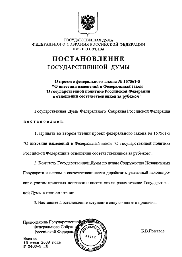 ПОСТАНОВЛЕНИЕ ГД ФС РФ от 15.07.2009 N 2463-5 ГД