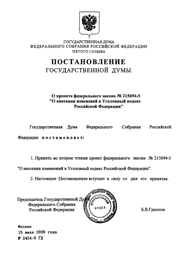 ПОСТАНОВЛЕНИЕ ГД ФС РФ от 15.07.2009 N 2454-5 ГД