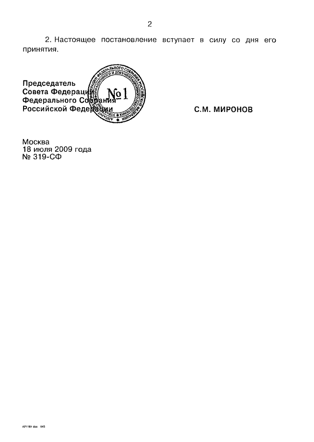 ПОСТАНОВЛЕНИЕ СФ ФС РФ от 18.07.2009 N 319-СФ
