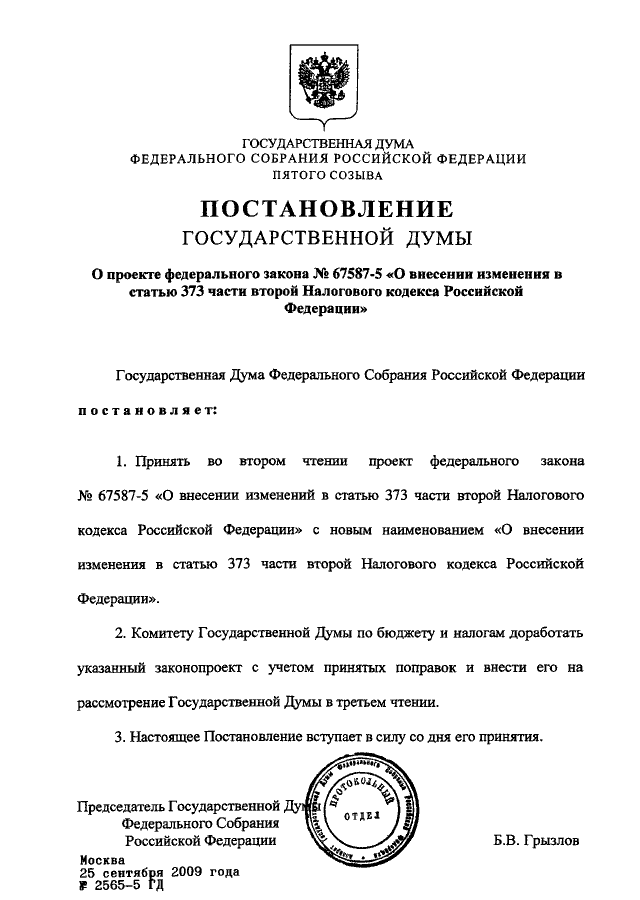 ПОСТАНОВЛЕНИЕ ГД ФС РФ от 25.09.2009 N 2565-5 ГД