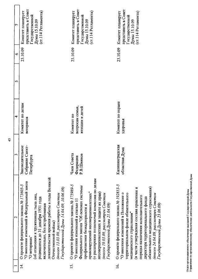 "О КАЛЕНДАРЕ РАССМОТРЕНИЯ ВОПРОСОВ ГОСУДАРСТВЕННОЙ ДУМОЙ С 7 ПО 23 ОКТЯБРЯ 2009 ГОДА"