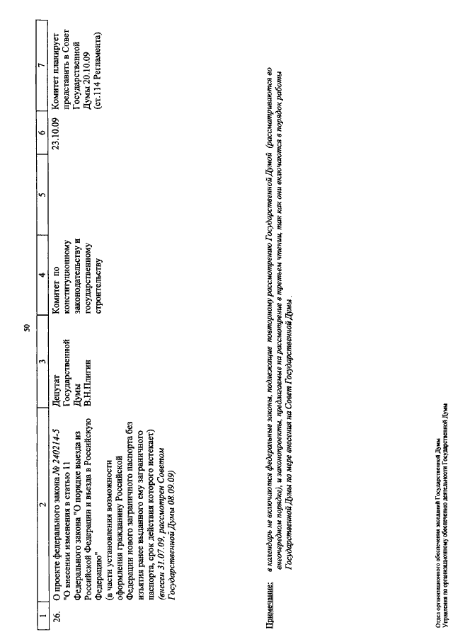 "О КАЛЕНДАРЕ РАССМОТРЕНИЯ ВОПРОСОВ ГОСУДАРСТВЕННОЙ ДУМОЙ С 7 ПО 23 ОКТЯБРЯ 2009 ГОДА"