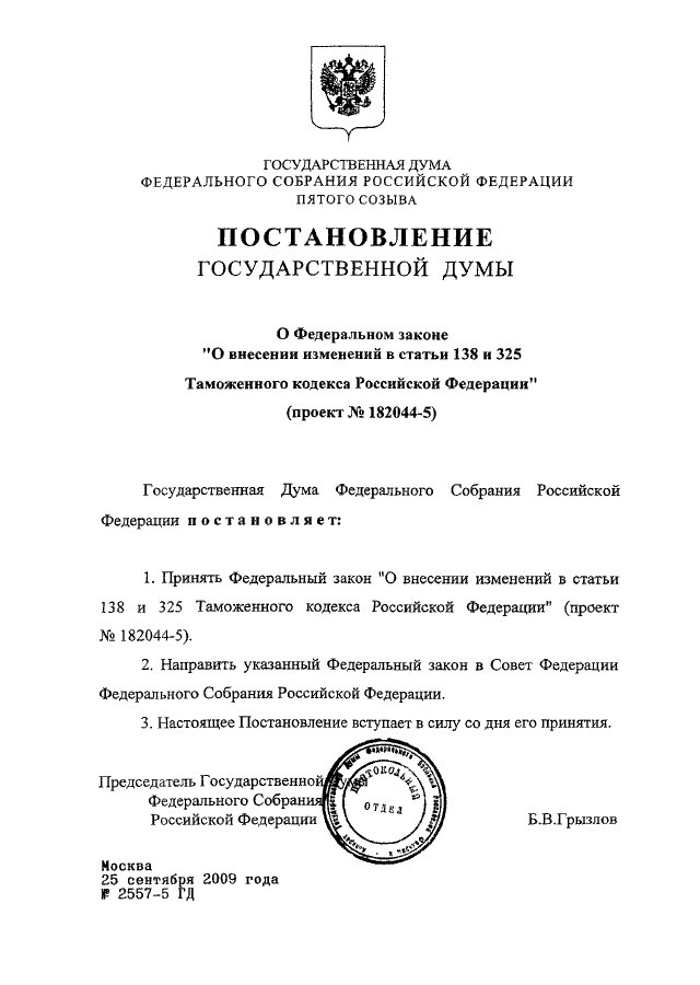ПОСТАНОВЛЕНИЕ ГД ФС РФ от 25.09.2009 N 2557-5 ГД