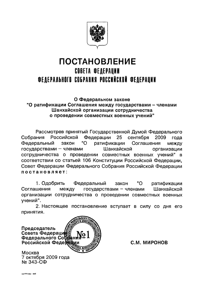 ПОСТАНОВЛЕНИЕ СФ ФС РФ от 07.10.2009 N 343-СФ