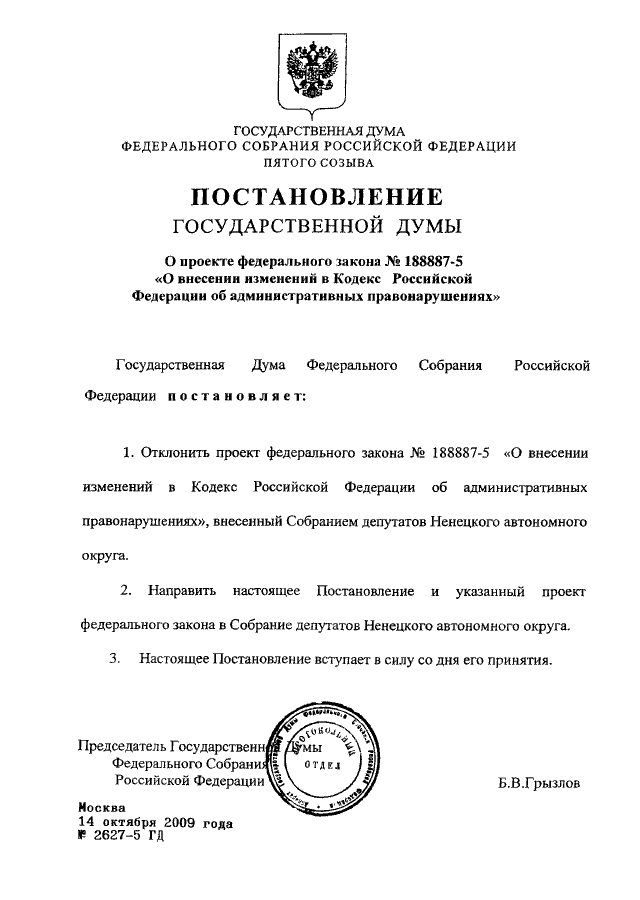 ПОСТАНОВЛЕНИЕ ГД ФС РФ от 14.10.2009 N 2627-5 ГД