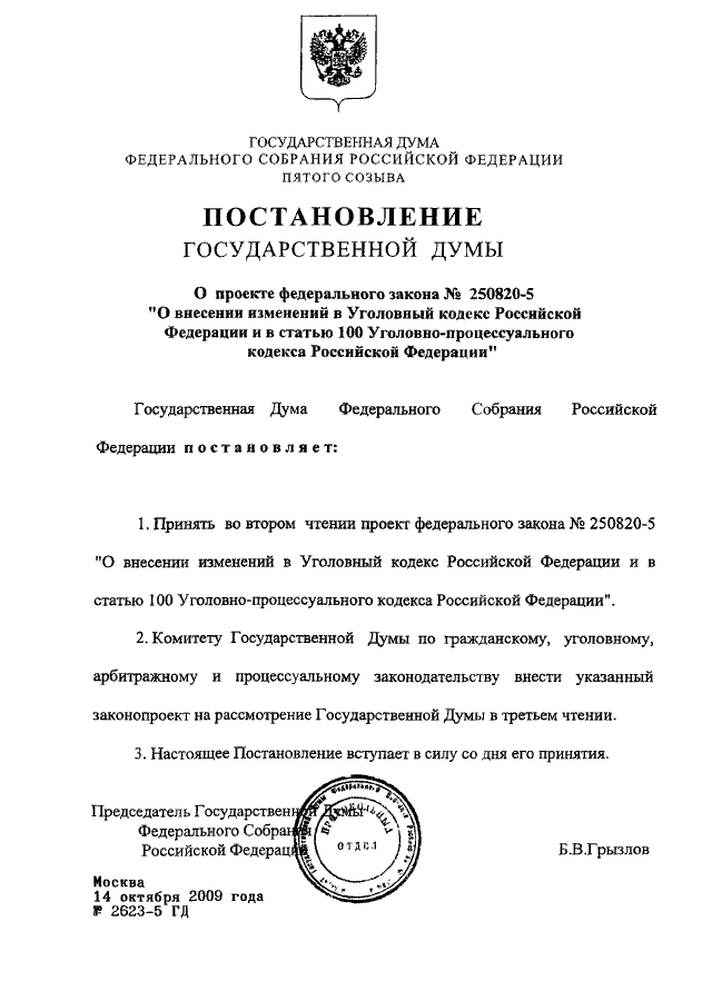 ПОСТАНОВЛЕНИЕ ГД ФС РФ от 14.10.2009 N 2623-5 ГД