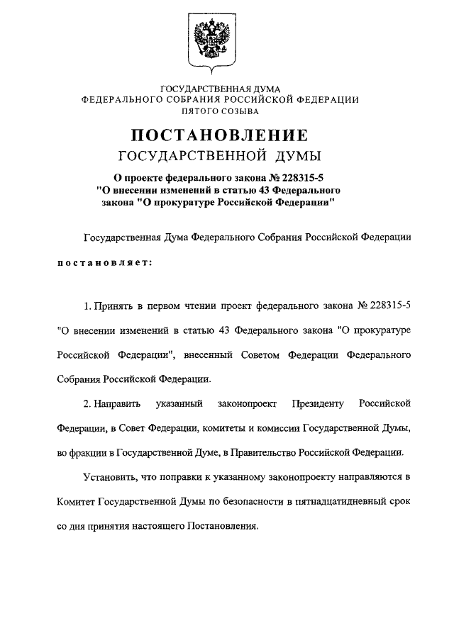 "О ПРОЕКТЕ ФЕДЕРАЛЬНОГО ЗАКОНА N 228315-5 "О ВНЕСЕНИИ ИЗМЕНЕНИЙ В СТАТЬЮ 43 ФЕДЕРАЛЬНОГО ЗАКОНА "О ПРОКУРАТУРЕ РОССИЙСКОЙ ФЕДЕРАЦИИ"
