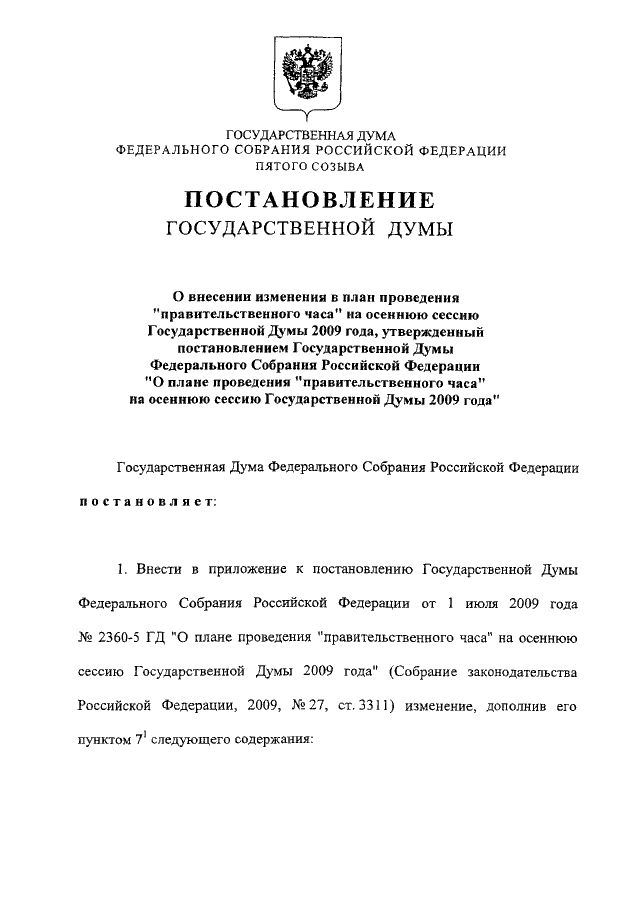 НА ОСЕННЮЮ СЕССИЮ ГОСУДАРСТВЕННОЙ ДУМЫ 2009 ГОДА, УТВЕРЖДЕННЫЙ
