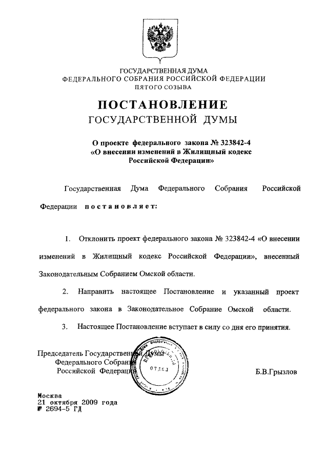 ПОСТАНОВЛЕНИЕ ГД ФС РФ от 21.10.2009 N 2694-5 ГД