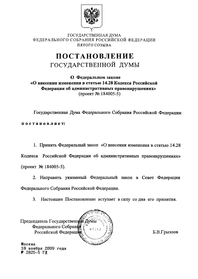 "О ФЕДЕРАЛЬНОМ ЗАКОНЕ "О ВНЕСЕНИИ ИЗМЕНЕНИЯ В СТАТЬЮ 14.28 КОДЕКСА РОССИЙСКОЙ ФЕДЕРАЦИИ ОБ АДМИНИСТРАТИВНЫХ ПРАВОНАРУШЕНИЯХ" (ПРОЕКТ N 184005-5)"