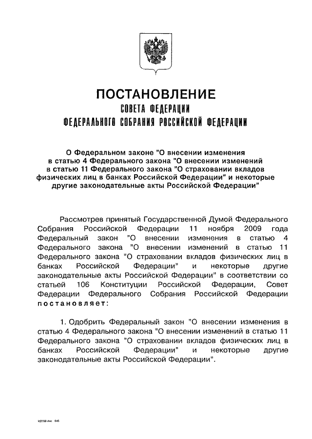 ПОСТАНОВЛЕНИЕ СФ ФС РФ от 18.11.2009 N 400-СФ