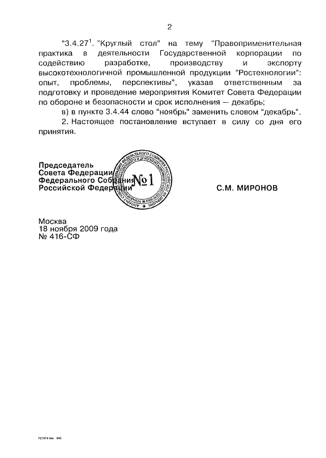 ПОСТАНОВЛЕНИЕ СФ ФС РФ от 18.11.2009 N 416-СФ