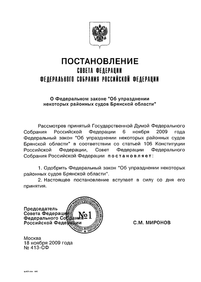 ПОСТАНОВЛЕНИЕ СФ ФС РФ от 18.11.2009 N 413-СФ