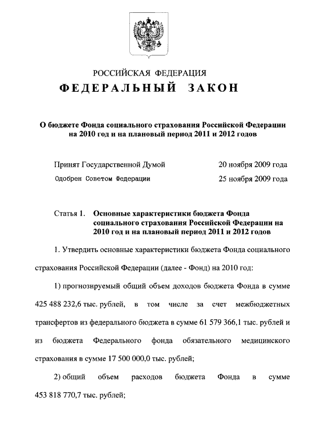 "О БЮДЖЕТЕ ФОНДА СОЦИАЛЬНОГО СТРАХОВАНИЯ РОССИЙСКОЙ ФЕДЕРАЦИИ НА 2010 ГОД И НА ПЛАНОВЫЙ ПЕРИОД 2011 И 2012 ГОДОВ"