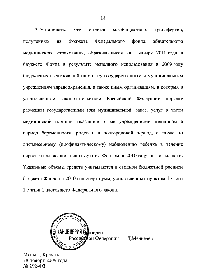 ФЕДЕРАЛЬНЫЙ ЗАКОН от 28.11.2009 N 292-ФЗ