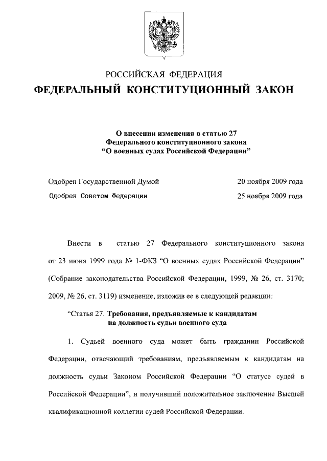 "О ВНЕСЕНИИ ИЗМЕНЕНИЯ В СТАТЬЮ 27 ФЕДЕРАЛЬНОГО КОНСТИТУЦИОННОГО ЗАКОНА "О ВОЕННЫХ СУДАХ РОССИЙСКОЙ ФЕДЕРАЦИИ"