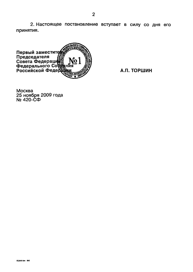 ПОСТАНОВЛЕНИЕ СФ ФС РФ от 25.11.2009 N 420-СФ